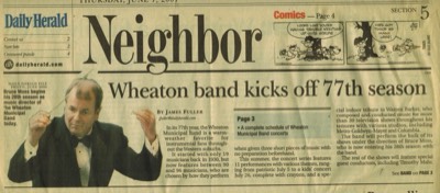 Col. Timothy Foley guest conducted the Wheaton Municipal Band. On that occassion, three former Wheaton Band members, also members of the President's Own United States Marine Band, came along. Roger Kantner (left), Jay Niepoetter, and Jennifer Marotta stand in uniform to Col. Foley's right.