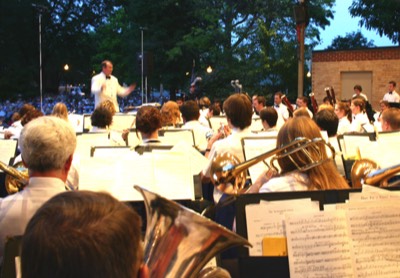 The old band shell. A small audience mid-concert in Memorial Park, Wheaton, IL