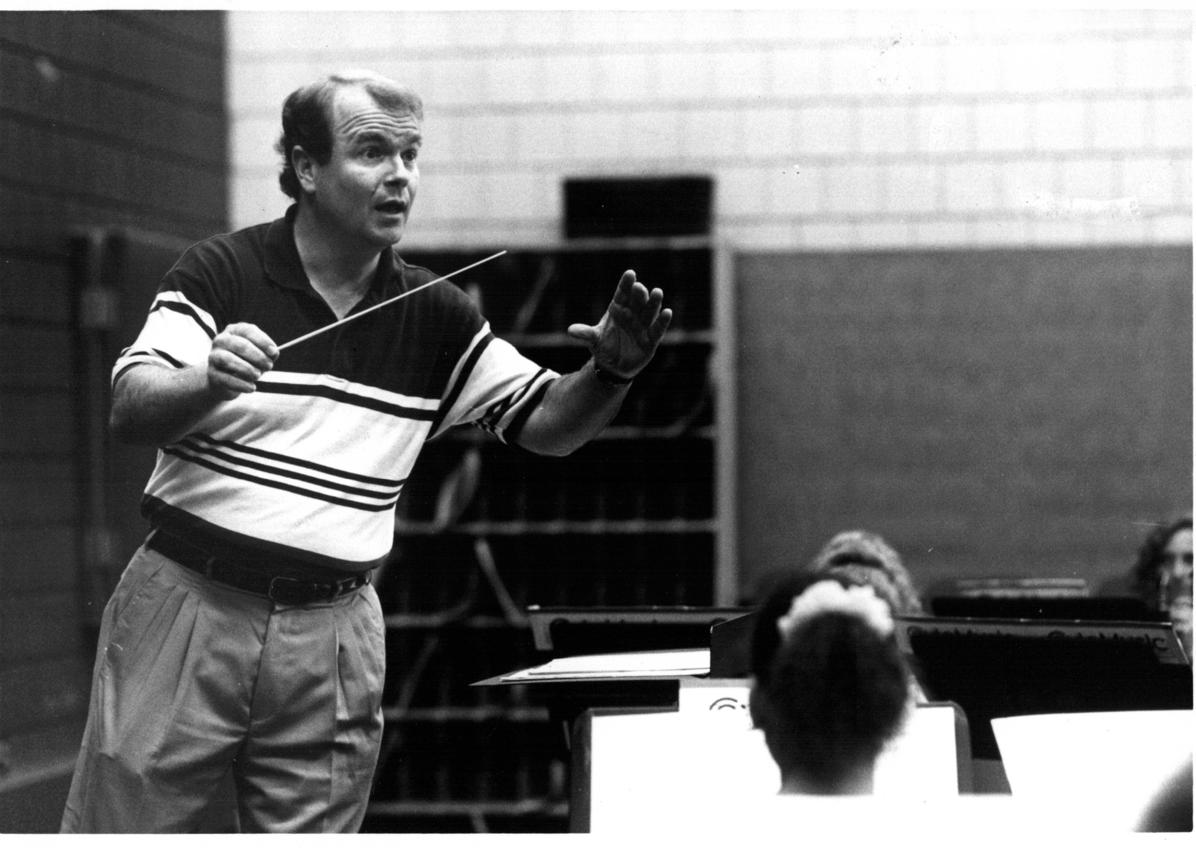 Bruce Moss rehearses the BGSU Symphonic Band in 1994 as the new Director of Bands. (Bowling Green State Univeristy, "Monitor Newsletter October 3, 1994" (1994))