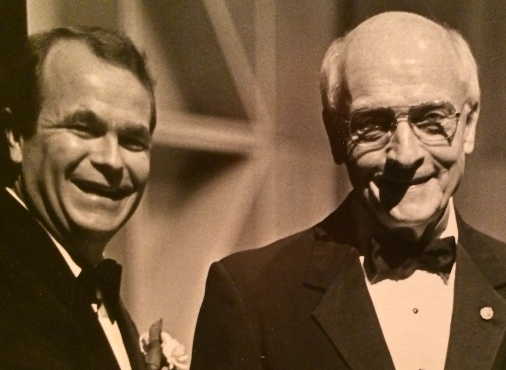 Bruce Moss with his predecessor, Mark Kelly (BGSU Dir. of Bands, 1966-1994) in Kobacker Hall (1995). (photo: Karen Kelly)