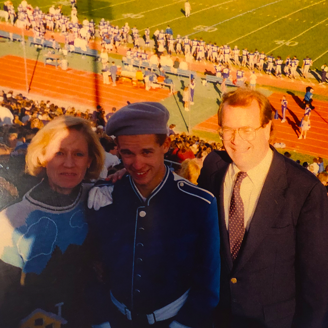 A young Ryan Hourigan, dressed in EIU Panther Marching Band uniform, stands next to his mother and EIU Director of Bands Bruce Moss on a bright fall day at O'Brien Field, Charleston, IL. (photo: Ryan Hourigan)