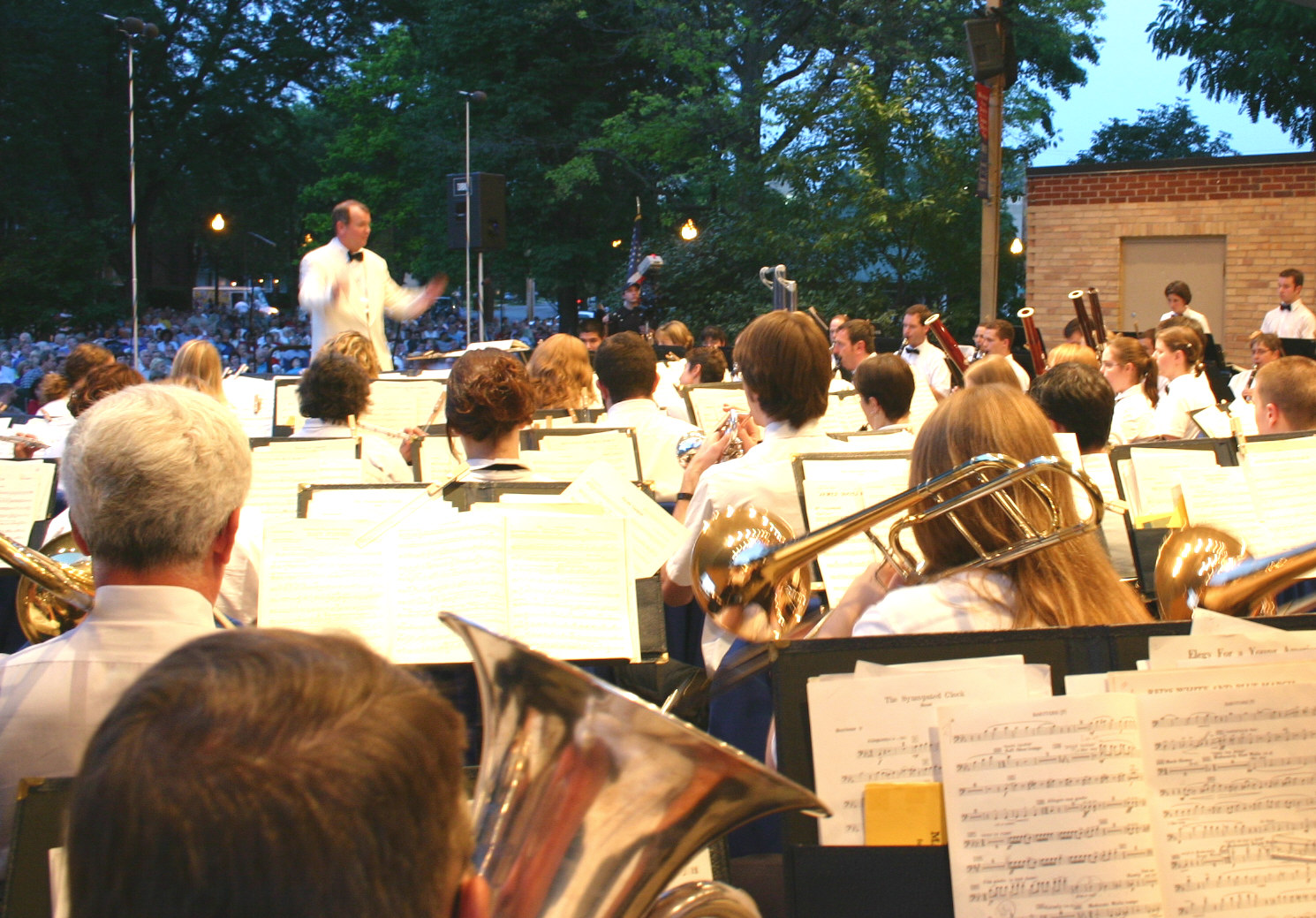The old band shell. A small audience mid-concert in Memorial Park, Wheaton, IL