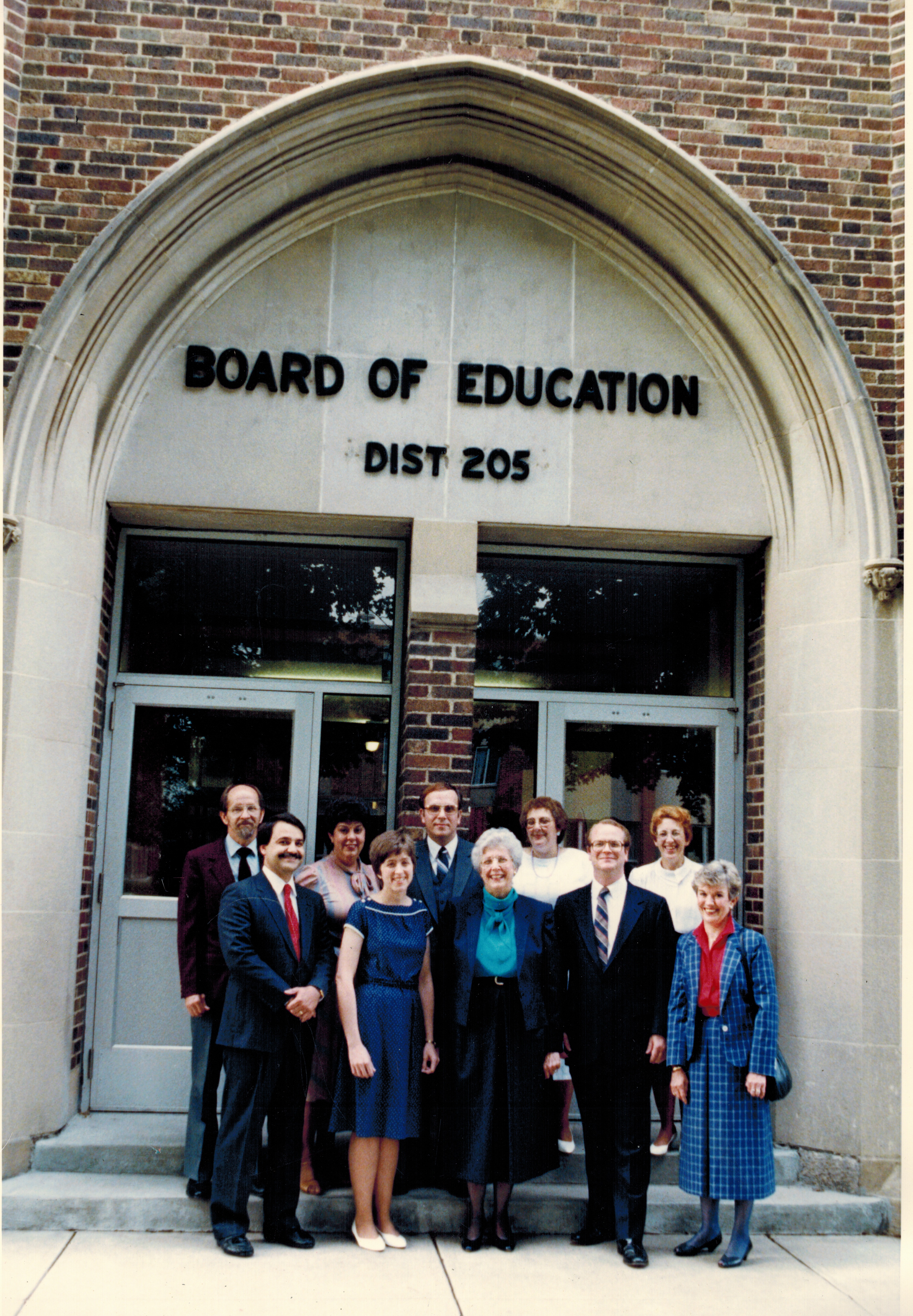 CUSD 205 teachers receive the district's "Excellence in Education Award" on the steps of the Board of Education Building (1986). Bruce Moss stands in the front row, second from right.